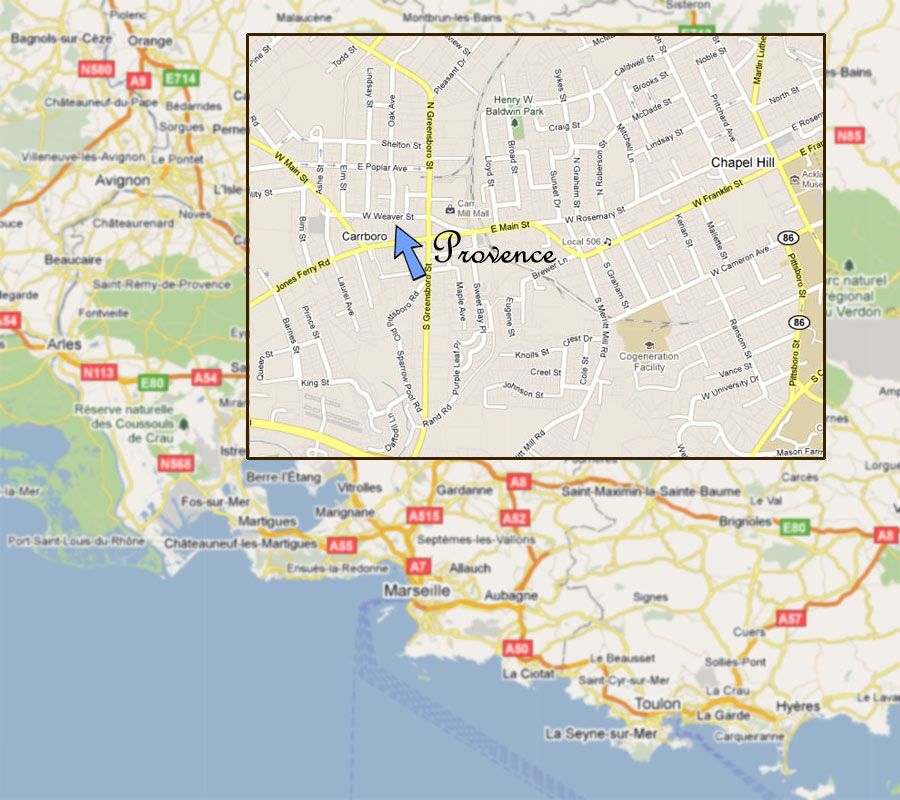Provence is located in the heart of downtown Carrboro, at 203 West Weaver Street.